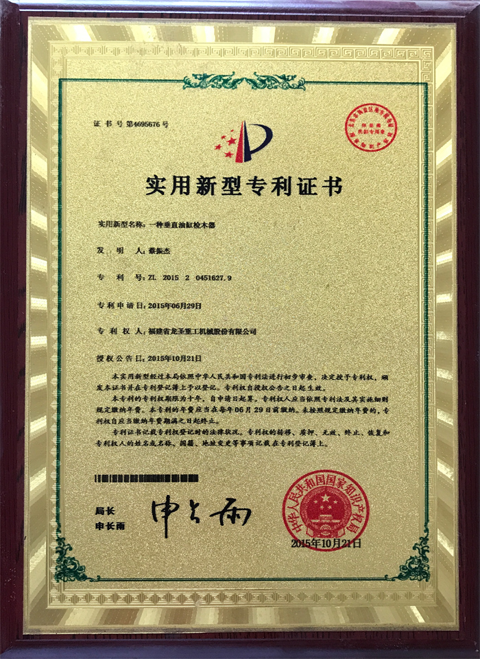 • 一種垂直油缸檢木器實用新型專利證書