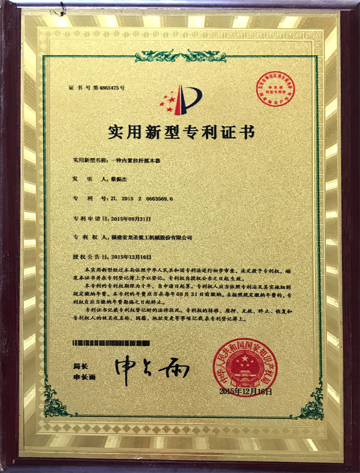 • 一種內(nèi)置拉桿抓木器實用新型專利證書