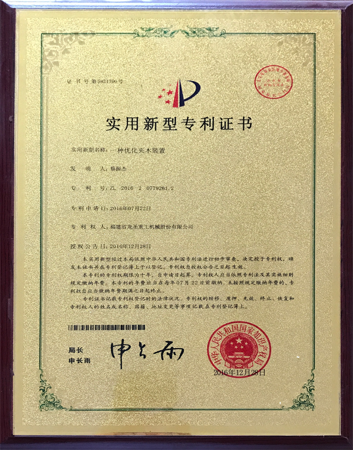 • 一種優(yōu)化夾木裝置實用新型專利證書