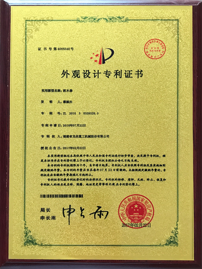• 抓木器外觀設(shè)計專利證書